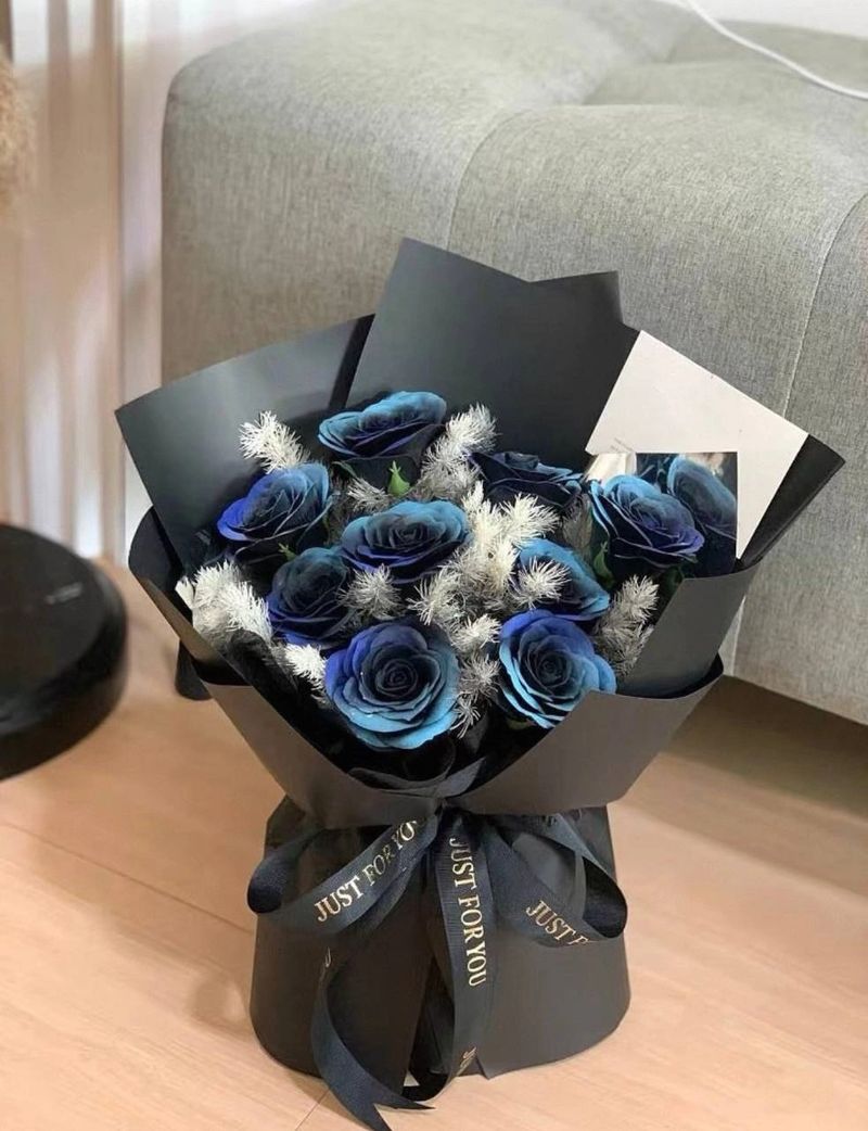A striking combination of red roses and blue flowers, wrapped in soft black for a regal, aesthetic vibe.
