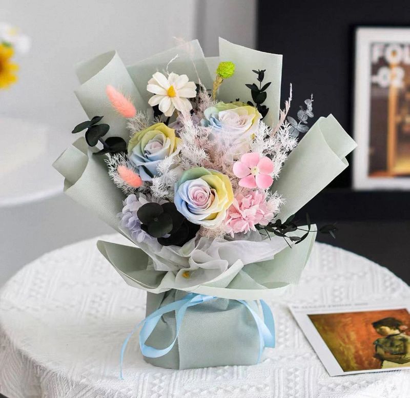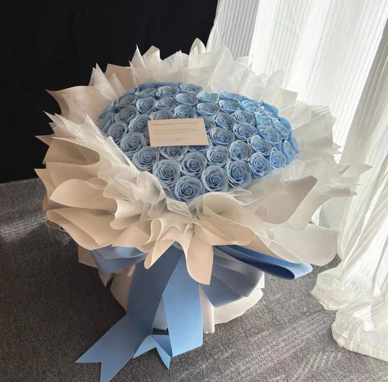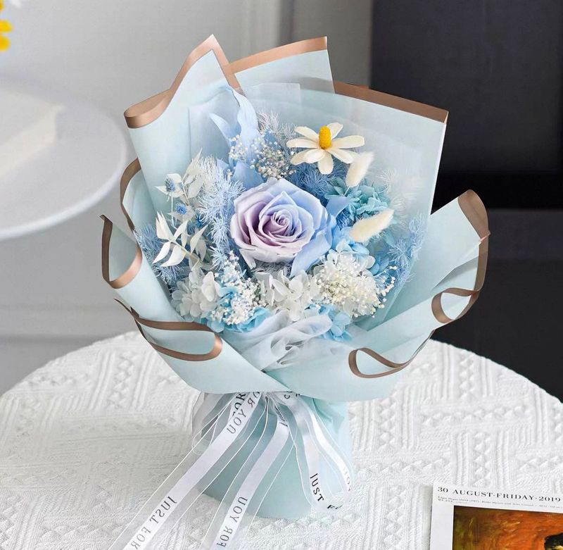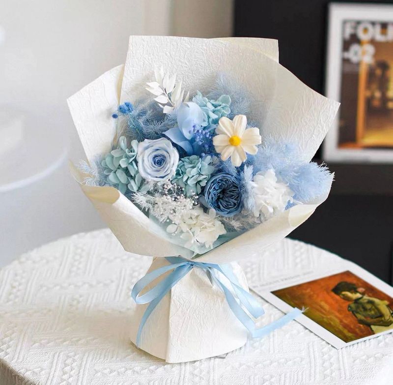 Delicate sky blue preserved flowers in crisp white wrapping, evoking calm, serenity, and timeless elegance.