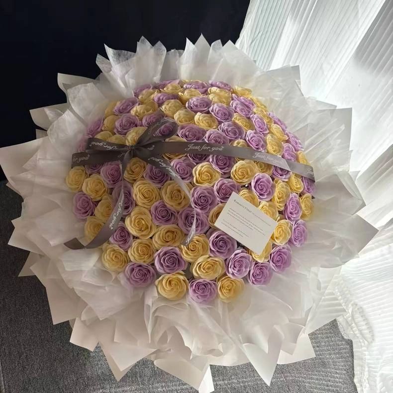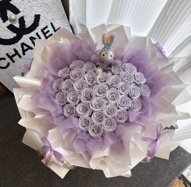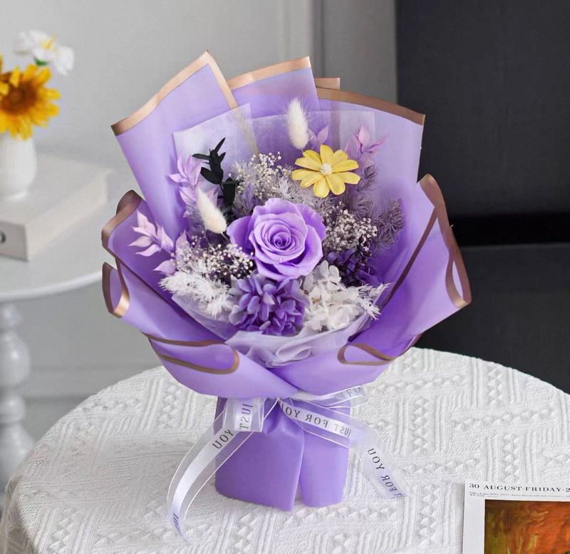 A luxurious bouquet of purple soap roses wrapped in white wrapping, creating a photogenic statement of beauty.