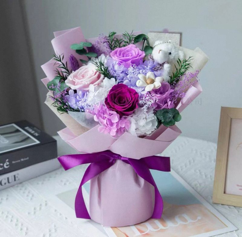 A striking mix of soft pink and purple blooms, elegantly wrapped and paired with a cuddly teddy bear for a regal yet adorable gift.