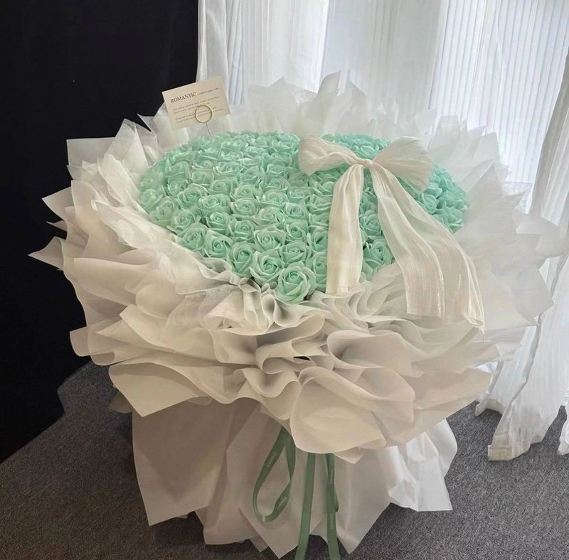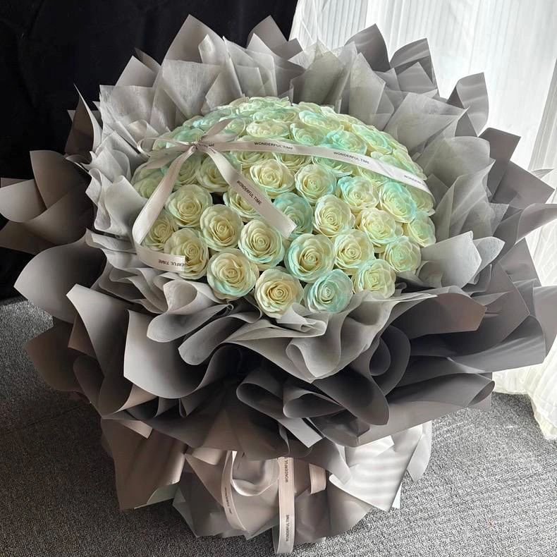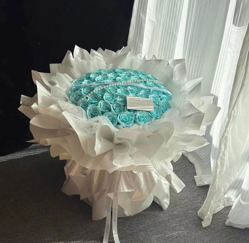 A dreamy arrangement of sky blue roses with a bold bow, perfect for a sweet yet luxurious gift.