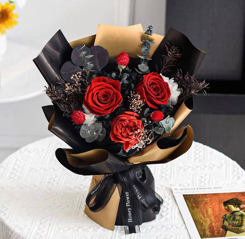 Three luxurious preserved red roses with fresh green foliage, enveloped in chic black wrapping.