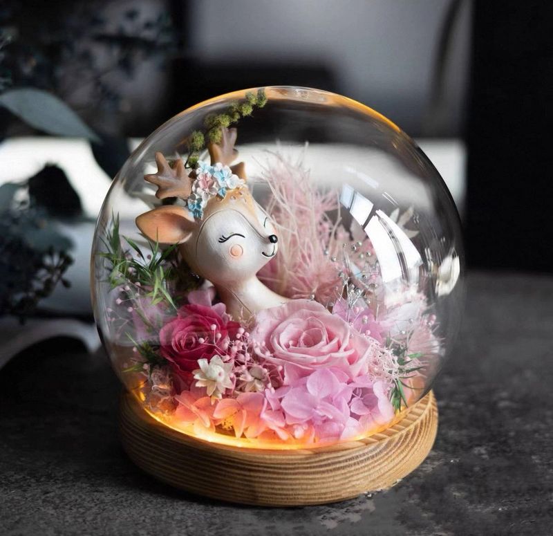 A serene and aesthetic arrangement with soft pink preserved roses inside a clear dome, featuring a sweet deer figurine.