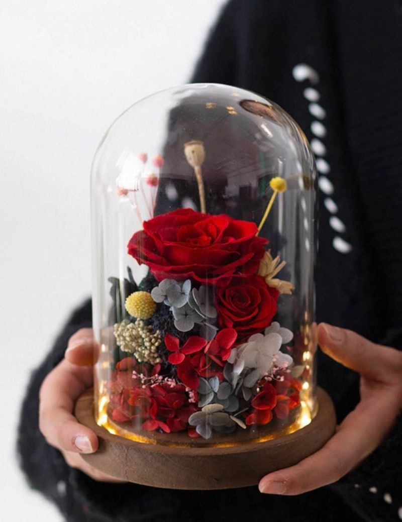Deep red roses elegantly preserved in a clear glass dome for a luxurious and photogenic presentation.